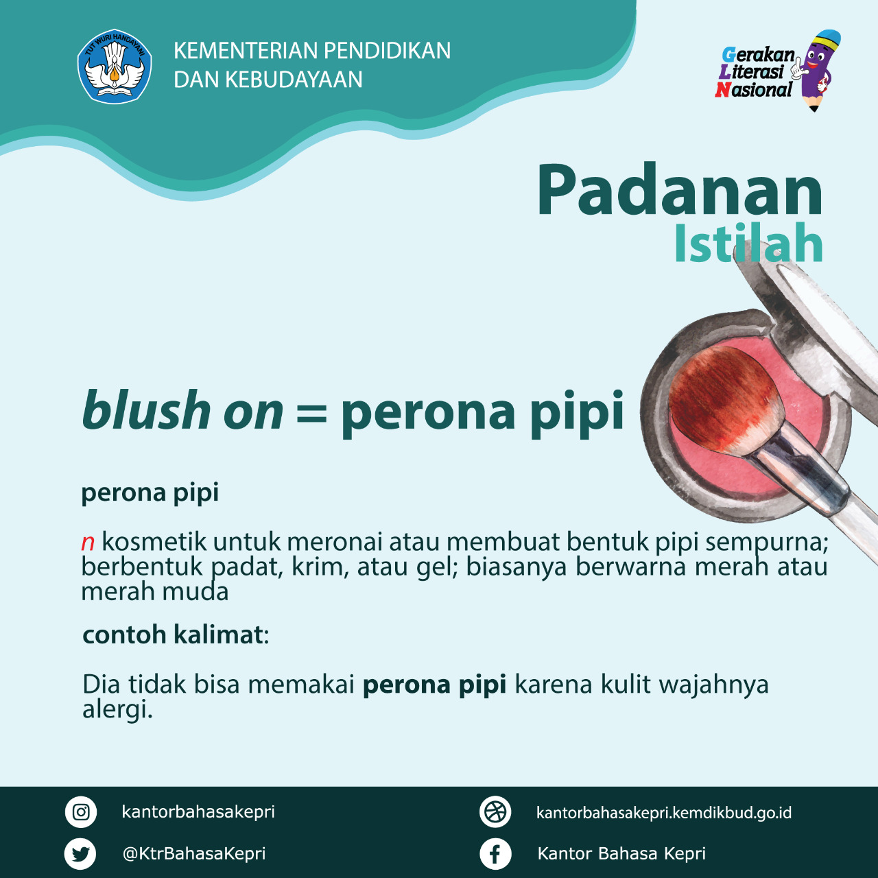 Halo, Sahabat bahasa. Hari ini kita belajar tentang padanan istilah. Istilah hari ini adalah "blush on" yang mempunyai padanan istilah "perona pipi".